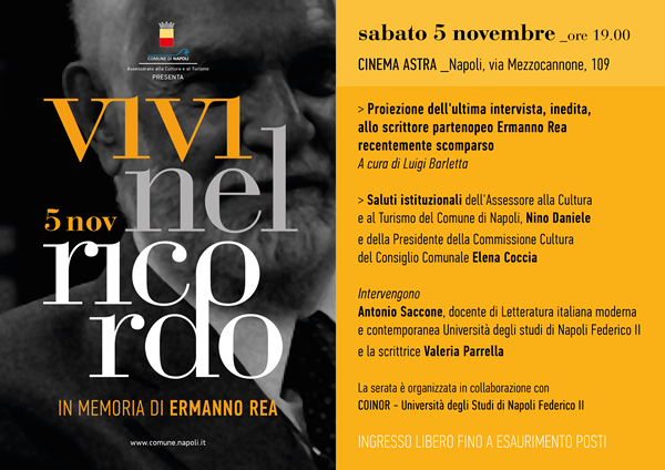 Proiezione dell'ultima intervista, inedita, allo scrittore partenopeo Ermanno Rea. A cura di Elena Coccia e Luigi Barletta Saluti istituzionali di Nino Daniele - Assessore alla Cultura e al Turismo del Comune di Napoli e di Elena Coccia - Presidente della Commissione Cultura del Consiglio Comunale Intervengono: Antonio Saccone, docente di Letteratura italiana moderna e contemporanea Università degli studi di Napoli Federico II e la scrittrice Valeria Parrella La serata è organizzata in collaborazione con COINOR - Università degli Studi di Napoli Federico II Si chiude con un evento dedicato alla memoria di Ermanno Rea, recentemente scomparso, il format istituzionale Vivi nel ricordo 2016_II edizione, a cura dell'Assessorato alla Cultura e al Turismo del Comune di Napoli. Sabato 5 novembre, alle 19.00, al cinema Astra di via Mezzocannone, in collaborazione con il COINOR - Università degli Studi di Napoli Federico II, sarà proiettata l'ultima intervista inedita allo scrittore raccolta da Elena Coccia. Il ricordo di Rea è affidato ad Antonio Saccone, professore di Letteratura Italiana Moderna e Contemporanea della Federico II e alla scrittrice Valeria Parrella. Introducono la serata l'Assessore alla Cultura e al Turismo del Comune di Napoli Nino Daniele e la Presidente della Commissione Cultura del Consiglio Comunale Elena Coccia. Si chiude con un evento dedicato alla memoria di Ermanno Rea, recentemente scomparso, il format istituzionale Vivi nel ricordo 2016_II edizione, a cura dell'Assessorato alla Cultura e al Turismo del Comune di Napoli. Sabato 5 novembre, alle 19.00, al cinema Astra di via Mezzocannone, in collaborazione con il COINOR - Università degli Studi di Napoli Federico II, sarà proiettata l'ultima intervista inedita allo scrittore raccolta da Elena Coccia. Il ricordo di Rea è affidato ad Antonio Saccone, professore di Letteratura Italiana Moderna e Contemporanea della Federico II e alla scrittrice Valeria Parrella. Introducono la serata l'Assessore alla Cultura e al Turismo del Comune di Napoli Nino Daniele e la Presidente della Commissione Cultura del Consiglio Comunale Elena Coccia. Dal 29 ottobre al 6 novembre sono stati organizzati un insieme di eventi volti alla valorizzazione del patrimonio storico-artistico e immateriale-culturale della città e alla creazione di nuovi percorsi di visita da offrire ai cittadini e ai turisti quali quelli nei cimiteri storici e monumentali di Napoli, come già avviene nelle altre capitali europee, e in altri luoghi legati al ricordo di illustri personaggi. Un ricco programma quello di Vivi nel ricordo 2016 che questa sera, venerdì 4 novembre, vedrà in scena al Museo Nazionale Ferroviario di Pietrarsa lo spettacolo teatrale DI FERRO E DI CUORE. ANDARE PER TRENI E STAZIONI per rivivere la storia del viaggio nel Novecento attraverso documenti inediti tratti dal libro di Enrico Menduni per la regia di Ettore Massarese. Le letture dei testi sono affidate ad Anna Maria Ackermann, Giovanna Capone Massarese, Hedy Caggiano, Giacomo Casaula, Ottavio Costa, Tullio Del Matto, Gigi Savoia e saranno accompagnate dalle musiche di Igor Stravinski, Arthur Honegger, Pierre Boulez, Giuseppe Verdi, Gaetano Donizetti. |