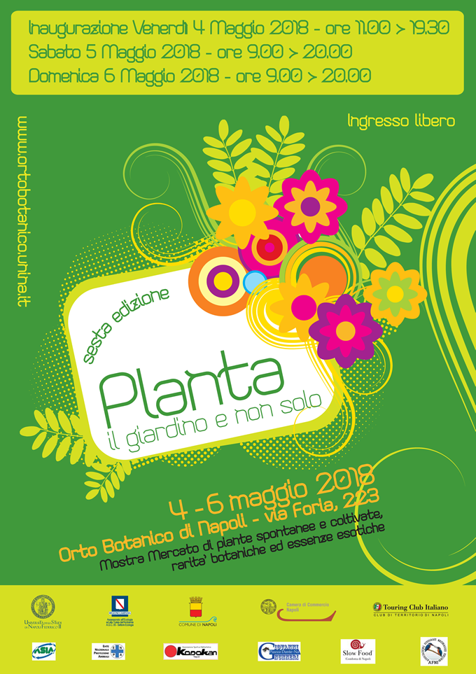 Torna all’Orto Botanico dell’Università degli studi di Napoli la VI edizione di "Planta, il giardino e non solo ", mostra mercato dedicata al florovivaismo di qualità. Piante e fiori di stagione, sementi esclusive, rarità botaniche ed essenze esotiche ma anche prodotti dell’orto e del frutteto, cesterie, attrezzature per il giardino, incontri tematici, presentazioni di libri e laboratori didattici. Un appuntamento molto atteso per fare acquisti di qualità e conoscere in maggior dettaglio le novità del verde ornamentale, i nuovi trend di progettazione giardini e le più diffuse tecniche di giardinaggio. L’evento si terrà presso gli spazi dei viali dell’Orto Botanico nei giorni 4, 5 e 6 maggio 2018.