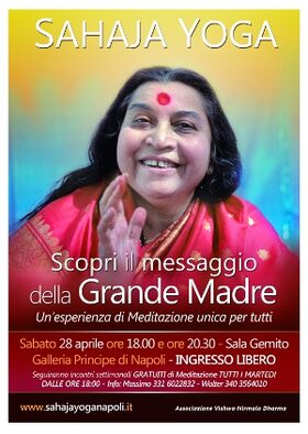 Sabato 28 aprile, nella Sala Gemito della Galleria Principe di Napoli si terrà l'incontro, patrocinato dal Comune di Napoli, "Sahaja Joga: un'esperienza di meditazione unica per tutti" durante il quale verranno presentate e sperimentate le straordinarie potenzialità dell'omonima scoperta di Shri Mataji Nirmala Devi, grande maestra spirituale riconosciuta in tutto il mondo come messaggera di pace e armonia tra i popoli.