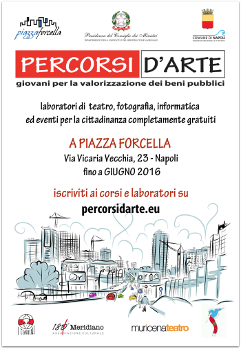 Tra teatro, fotografia e informatica, continua fino a giugno 2016 il progetto di formazione culturale e professionale "Percorsi d'Arte" ideato e curato dalle AssociazioniI Teatrini, 180° Meridiano, Muricena Teatro e Teatri di Seta. Un'intensa attività, promossa dal Comune di Napoli, e finanziata, attraverso il bando nazionale "Giovani per la valorizzazione dei beni pubblici", dalla Presidenza del Consiglio dei Ministri - Dipartimento della Gioventù e del Servizio Civile Nazionale. "Percorsi d'arte" ha sede stabile a Piazza Forcella, struttura polifunzionale dedicata alla memoria di Annalisa Durante, ragazzina di 14 anni uccisa dalla criminalità organizzata, ubicata nei ristrutturati locali dell'ex Supercinema di via Vicaria Vecchia 23, e si rivolge ai giovani (d'età compresa tra i 14 ed i 30 anni) proponendo per essi un'attività continuativa, completamente gratuita, che partità a dicembre dello scorso anno si sviluppa nell'arco di 18 mesi. Dopo la pausa estiva, sono già ripresi gli incontri del laboratorio "Il Teatro dell'Immaginario"per giovani attori del teatro per l'infanzia e la gioventù diretto da Giovanna Facciolo per I Teatrini, il laboratorio teatrale per ragazzi "Fare Teatro"diretto da Raffaele Parisi e gli attori di Muricena Teatro, e il corso "Fotografia e Lavoro"a cura di Pino Miraglia per l'Ass. 180° Meridiano. |
