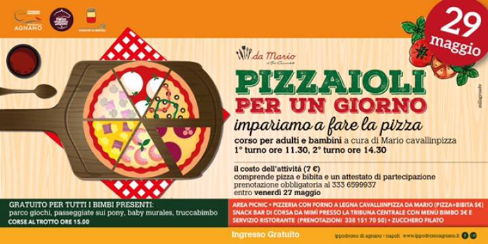 Domenica 29 maggio all'ippodromo di Agnano ingresso gratuito dalle ore 10.30 con tante attività per la famiglia organizzate nel parco. A cominciare da "pizzaioli per un giorno", corso per adulti e bambini per imparare a fare la pizza organizzato in due turni (ore 11.30 e ore 14.30). Il costo dell'attività (7 euro) comprende pizza, bibita e attestato di partecipazione (a cura della pizzeria dell'ippodromo "Da Mario Cavallinpizza" gradita la prenotazione al corso 333 6599937). E ancora, truccabimbo, "happy color baby murales" per liberare la creatività dei piccoli attraverso tanti colori da disegnare su grandi pannelli e passeggiate gratuite su pony per un giretto in sella nei giardini dell'ippodromo; parco giochi e accesso con bici, pattini, monopattini e pallone per giocare all'aperto liberi e sicuri.