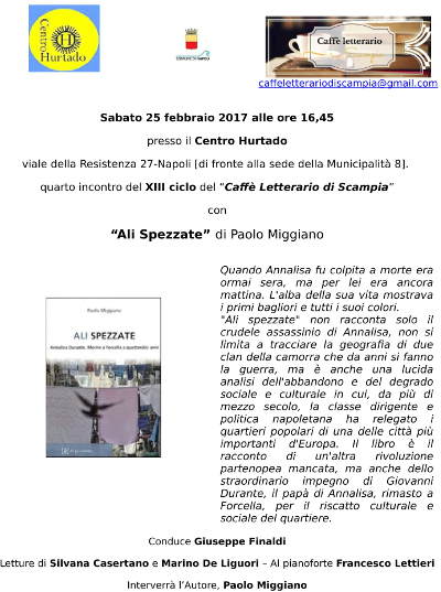 Sabato 25 febbraio 2017 , alle ore 16.45 , presso il Centro Hurtado, in viale della Resistenza n. 27 (di fronte alla sede della Municipalità VIII), con il patrocinio del Comune di Napoli , si svolgerà il  quarto appuntamento del Caffè Letterario di Scampia, edizione 2016/2017.Saranno letti brani da  "Ali Spezzate" di Paolo Miggiano . Il libro racconta la tragica uccisione "per errore" di Annalisa Durante , avvenuta il 27 Marzo del 2004, a Forcella, durante un regolamento di conti a colpi