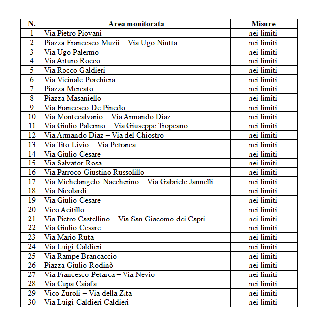 Le aree monitorate sono riportate nell’elenco che segue e per tutte sono state registrate misure rientranti nei limiti della normativa in materia.
