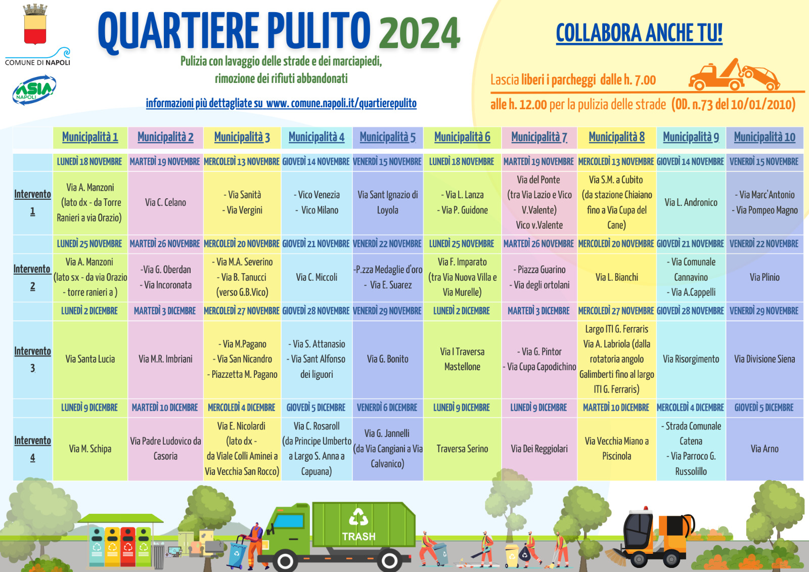 Riprende “Quartiere Pulito” l’iniziativa voluta dal Sindaco Gaetano Manfredi, che ha visto finora oltre 320 interventi su strade e piazze delle dieci Municipalità, con operazioni di pulizia radicale, diserbo, spazzamento e lavaggio dei marciapiedi, oltre alla rimozione delle campane per consentire la pulizia delle aree sottostanti.
