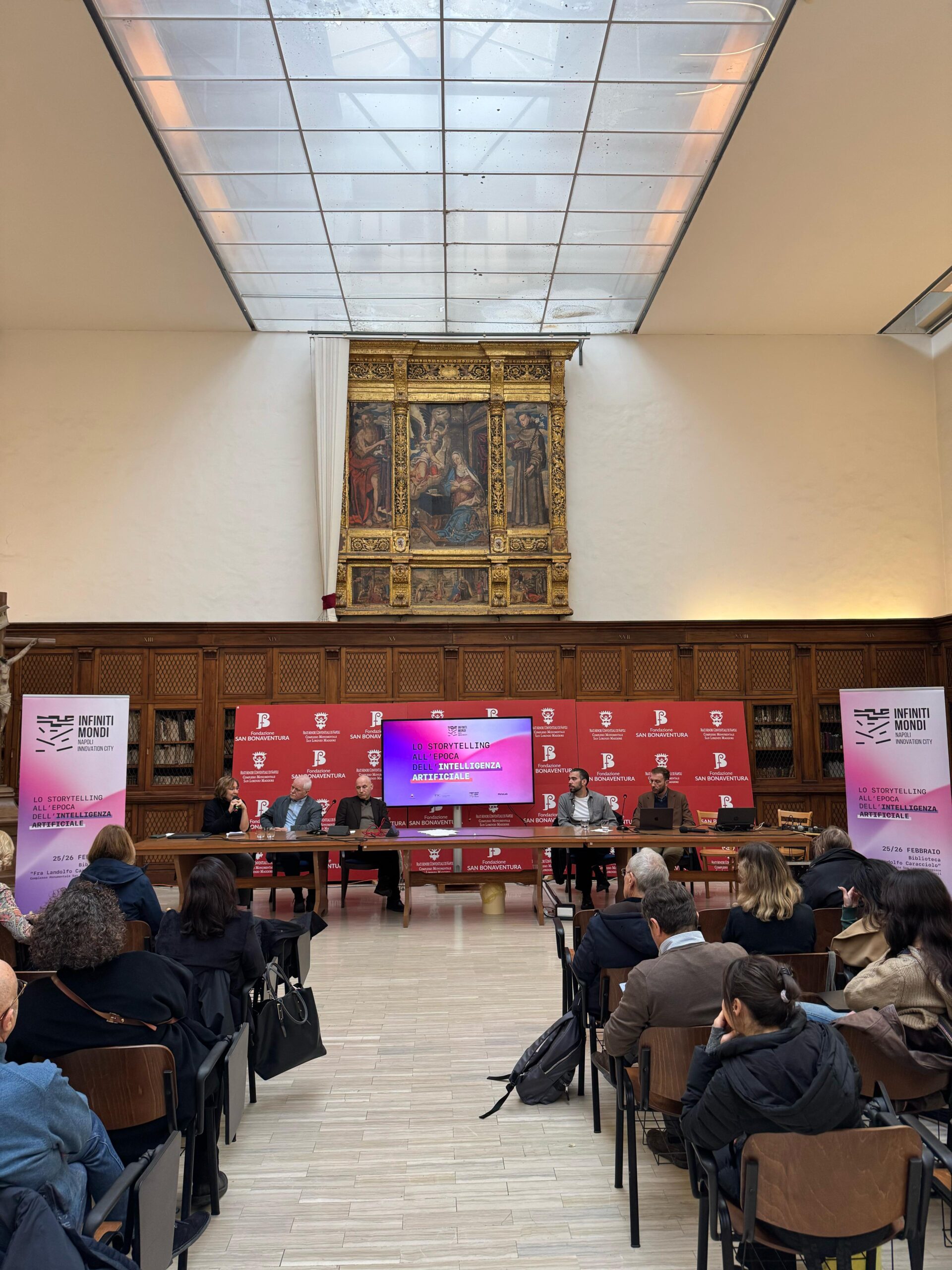 Mercoledì 26 febbraio, presso la Biblioteca del Complesso Monumentale di San Lorenzo, esperti del settore hanno risposto a questi interrogativi: Riccardo Milanesi, docente di Transmedia Studies alla Sapienza Università di Roma, docente e consulente di transmedia storytelling alla Scuola Holden di Torino e co-direttore dell’Holden.ai StoryLab; Giovanni Abitante, AI filmmaker / AI director, docente di filmmaking AI alla Scuola Holden di Torino; Edoardo Fleischner, già docente di Comunicazione crossmediale all’Università degli Studi di Milano; Filippo Gregoretti, artista generativo e docente di progettazione transmediale Università degli Studi Suor Orsola Benincasa di Napoli.L’evento, aperto alla città, sarà introdotto dai saluti del Capo di Gabinetto del Comune di Napoli, Mari Grazia Falciatore.
