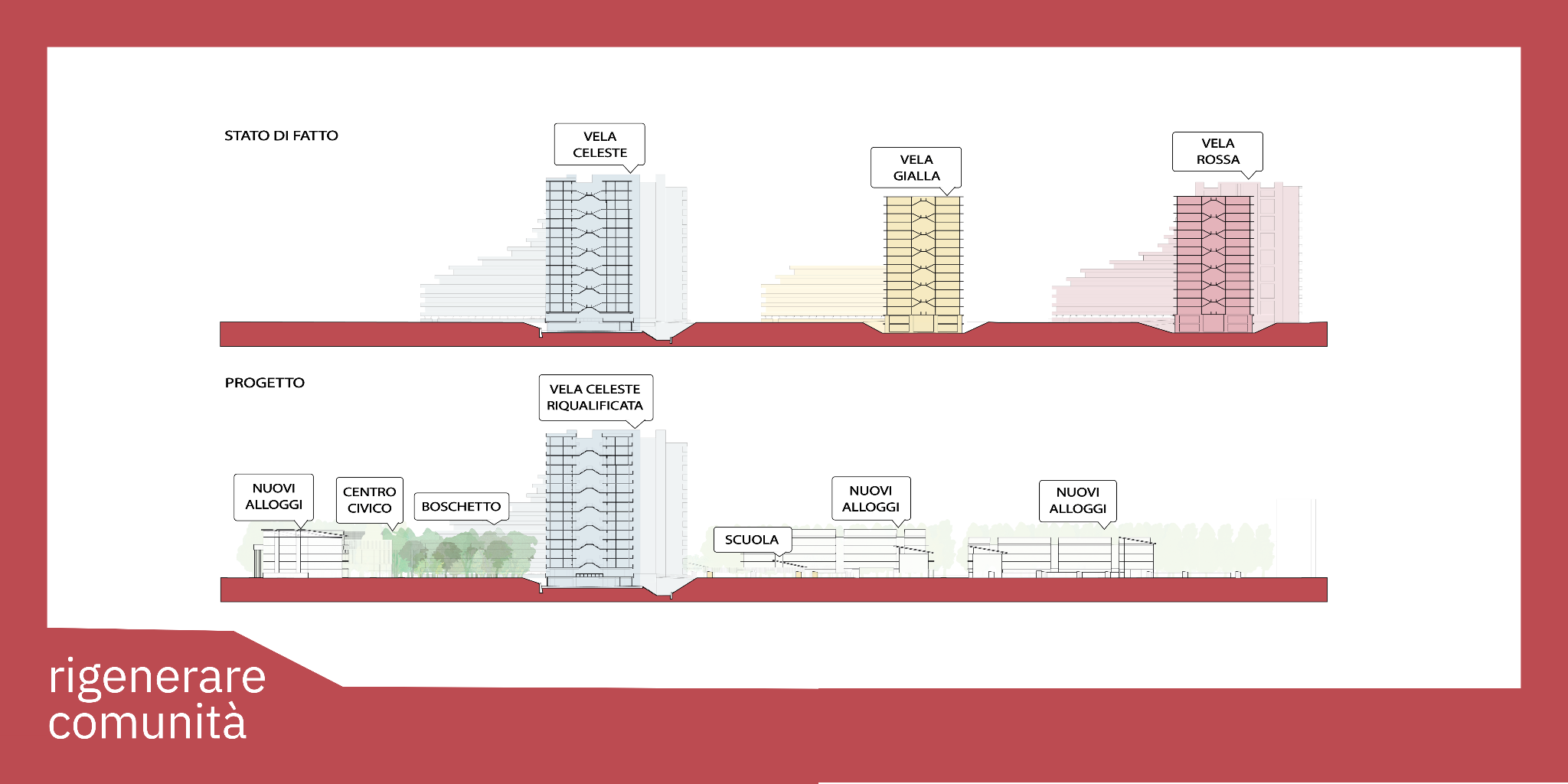 Inoltre, è essenziale contrastare le difficoltà sociali ed economiche presenti nel quartiere. Per affrontare queste sfide, il progetto propone la creazione di spazi e attività comunitarie, insieme alla promozione dell’integrazione e della partecipazione del Terzo settore e dei residenti stessi. Inoltre, il recupero e la riqualificazione della Vela Celeste, integrando funzioni miste, con una prevalenza di attrezzature pubbliche e la realizzazione di nuovi viali pubblici, pedonali e ciclabili.