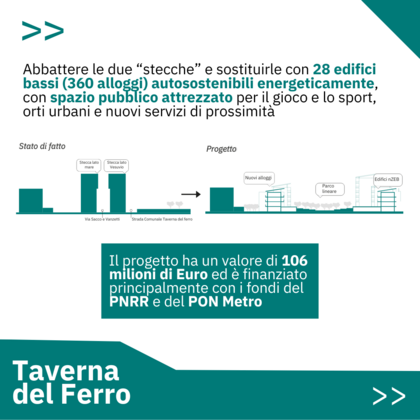 Nella fase finale, si completerà il progetto con la realizzazione del parco lineare, includendo gli orti urbani e lo spazio attrezzato per lo sport sull’area della stecca lato Vesuvio demolita. Questo segna il completamento dell’intervento di riqualificazione, trasformando Taverna del Ferro in un quartiere più sostenibile, vivibile e accogliente.