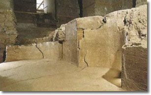 La struttura presenta due pilastri posti alla distanza di m. 2,35, che inquadravano verosimilmente un vano di passaggio. Al livello dello spiccato del muro si appoggiava un battuto di calce bianca che sigillava il riempimento della struttura a nicchie, occupando gran parte della zona orientale dell’ambiente di scavo.