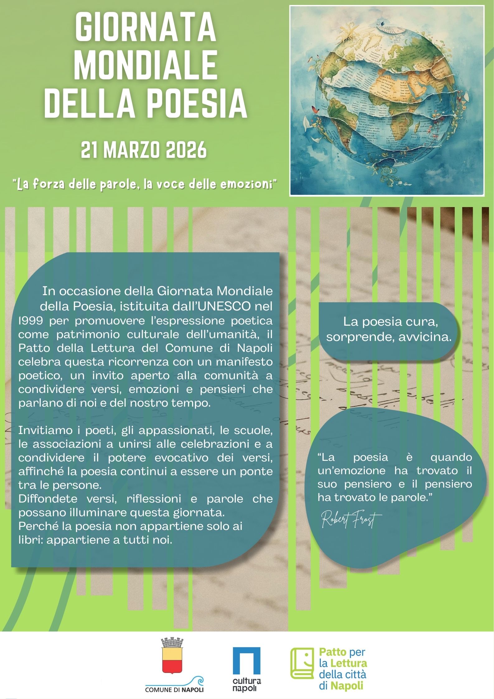 Il Patto della Lettura del Comune di Napoli celebra questa ricorrenza con un manifesto poetico, un invito aperto alla comunità a condividere versi, emozioni e pensieri che parlano di noi e del nostro tempo.