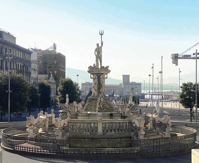 La Fontana del Nettuno – detta poi Medina – presenta caratteri compositivi complessi tra architettura e scultura, impiegando una elaborata varietà di elementi strutturali e figure realizzati in marmo bianco di Carrara e elementi decorativi in bardiglio.