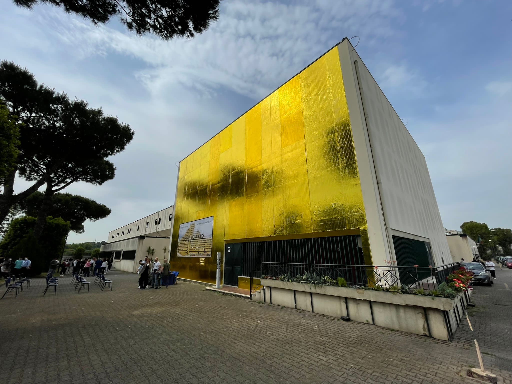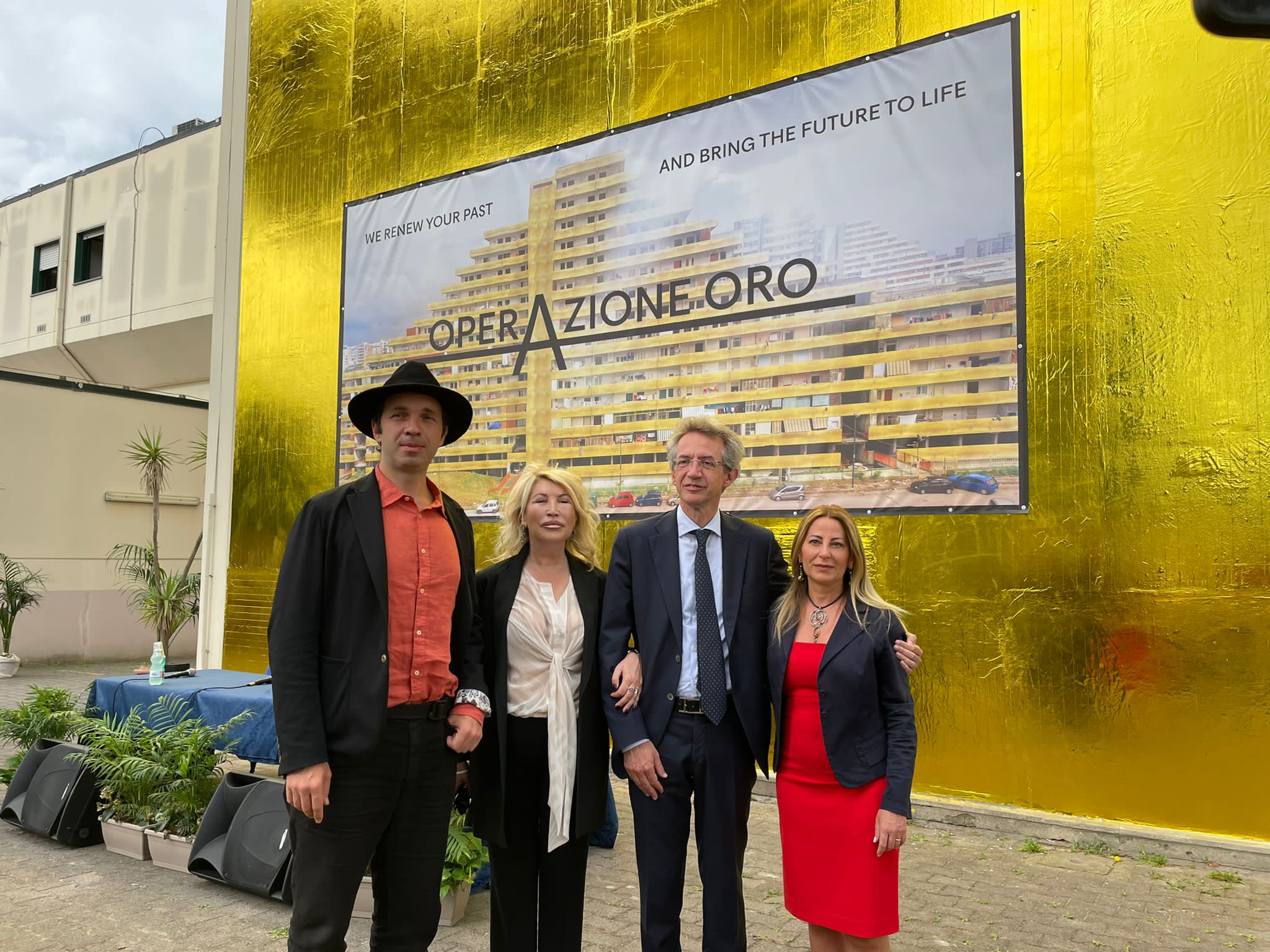 E’ stata inaugurata questa mattina, alla presenza del Sindaco di Napoli Gaetano Manfredi “Operazione Oro” l’installazione dell’artista francese Zevs che ha trasformato in un luminosissimo pannello dorato la facciata dell’istituto “Marie Curie”, a Via Argine. L’installazione dell’artista francese, figura di spicco della street art europea, ha ottenuto lo straordinario effetto di doratura sfruttando il cromatismo delle coperte termiche usate nelle operazioni di soccorso. Parte integrante dell’opera è un finto poster pubblicitario contenente l’immagine di una delle vele di Scampia anch’essa dorata, rappresentazione iconica della sua rinascita.