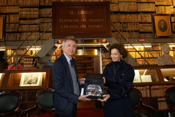 Nella biblioteca è stata donata all'ospite una maschera di Pulcinella realizzata dal maestro Lello Esposito ed il crest del Comune di Napoli.