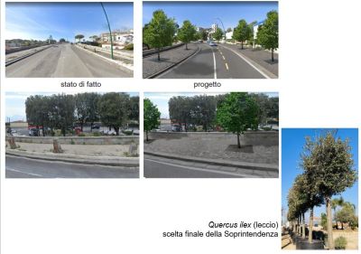 Per quanto riguarda le alberature il progetto prevede: l'eliminazione dei pini e delle ceppaie attualmente esistenti; la realizzazione di un nuovo filare arboreo su entrambi i marciapiedi che costeggiano la carreggiata, costituito da Quercus ilex (leccio); saranno in totale messi a dimora 84 lecci.