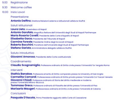 Dopo la presentazione di Antonio Delfino (Direttore Relazioni esterne e istituzionali Lefebvre Giuffrè) e i saluti di benvenuto di Stefano Garisto (Amministratore delegato Lefebvre Giuffrè), un panel di illustri accademici, coordinati da Claudio Scognamiglio (Professore ordinario di Diritto civile presso l’Università Tor Vergata Roma), approfondirà le tematiche centrali dell'evento. Interverranno: Stathis Banakas (Professore emerito di Diritto comparato presso la University of East Anglia), Carmelita Camardi, Professoressa ordinaria di Diritto privato presso l’Università Ca’ Foscari Venezia, Giovanni Chiodi (Professore ordinario di Storia del diritto medievale e moderno presso l’Università Milano-Bicocca), Tommaso Greco (Professore ordinario di Filosofia del diritto presso l’Università di Pisa) e Marisaria Maugeri (Professoressa ordinaria di Diritto civile presso l’Università di Catania).