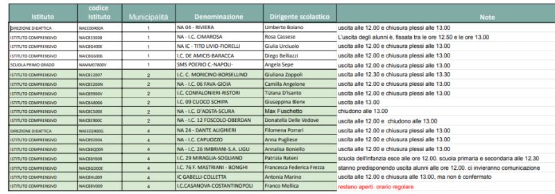 In occasione dell’arrivo a Napoli della Tappa del Giro d’Italia di giovedì 15 maggio, l’Amministrazione Comunale ha invitato le scuole della I, II, e IV Municipalità (coinvolte nel percorso della Tappa) a valutare, nell’ambito della loro autonomia, la possibilità di anticipare l’orario di uscita dei ragazzi. In allegato l’elenco delle scuole che hanno aderito.