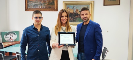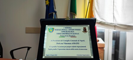 E' stata consegnata oggi alla Presidente del Consiglio comunale Vincenza Amato la targa commemorativa del 1° memorial “Pasquale Apicella Giovanni Vivenzio” – Coppa Regina Pacis, prima edizione del torneo amatoriale di calcio a 8 intitolato alla memoria dei due poliziotti napoletani scomparsi tragicamente in servizio nel 2020 e nel 2021.