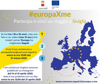 Il contest #europaXme mira a evidenziare il contributo che l'Europa ha dato e dà alla Città di Napoli attraverso video e foto. Le fotografie e i video dovranno mostrare in che modo l'Europa ha contribuito alla vita, alla cultura, all'istruzione, al lavoro e, in generale, alle politiche di sviluppo della Città di Napoli.