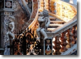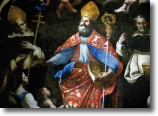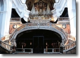 In the Sacristy upon the altar there is the picture of St. Domenico [painted by Giovanni Balducci, actually is located in the big chapel of the Circumcision, in the sacristy today there is "L'ultima cena", painted by Gianni Pisani in 2008]. In the penultimate chapel there is a Pacecco de Rosa's picture of St. Tommaso with angels holding the girdle of chastity, in the last chapel the Maddalena painted by Giordano. At the left of the altar of St. Tommaso set in the ancient wall the pontifical chair, which was first in the cemetery, used by the ancient bishops San Nostrano, S. Gaudioso and others; we can see a carved monogram of Christ. Look now at the marble pulpit, performed with rare invention by Dionisio Lazzari, which are also the two majestic staircases that lead up to the great altar, where a shrine of rock crystal and gilded copper, made from the dominican friar Azaria from Naples, the chorus has eighty seats and it is exquisitely worked, upon the organ there is the marble statue of Vergine della Sanità, a work of Naccarino [in the middle of the central nave today are located two works of Riccardo Dalisi, "la Mensa degli Angeli" of 2005 and "Palestina" of 2000].