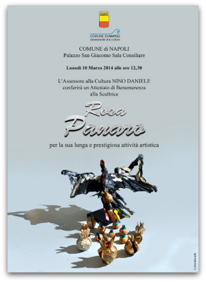Monday, March 10th, at 12:30 pm, at Palazzo San Giacomo, the Councillor Nino Daniele of the Department for Culture will give, on behalf of the city, to Rosa Panaro a certificate of appreciation and gratitude of the citizens and the City Council for her long and prestigious artistic activity.