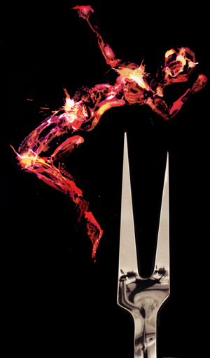 Domestic Olympic Games is a photographic reportage made of household objects such as the light bulb, the cap, the blade, the bottle. The artist, using his well-known technique, the "acid on photo paper", creates, with his unmistakable style, figures of athletes who interact with everyday objects. It will be possible to appreciste a sumo wrestler who fights with a corkscrew, a dancer dancing on a razor blade,and so on. The aim of the artist is to abandon the a priori knowledge of forms and shapes, every prejudice, to be overwhelmed by the unknown, the dream, the seductive mystery and wonderful art and life, beyond appearances and conventions.The images, at first, seem to obey a conventional formalism, who lack of inflections. The use of the camera is as a means of descriptive, free to discover the imagination and maintaining the formal resolution.They are images taken bend at the mercy of the artist who uses sotwares as hands that give a new shape to clay. He intervenes later using the painting, a tool that continues the work of the laboratory of development, a tool does not leave in peace the emulsion continuously, chaotically, a tool that determines the loss the superficial layers of shapes to give voice to colors. Differently form his previuos works, Montanaro uses the photografic image to immortalize in details everyday life essence. Giacomo Montanaro's reality has no ambition of complaint or social implications: he goes to plunder the smaller familiar pictures, not as icons in pop art, but frugal, almost banal everyday gesture. The realism of these images dialectically shpae the shamanic energy of his art, it does not stop the pulse of energy that forces him to dance in the photographic medium, but it involves looking for the holistic connection with the cosmic scheme of things. This emotional tension evoked by the object, which is released as a swollen river in the flick of Giacomo Montanaro, has nothing to do with the so-called 'supernatural'.The artist recognizes everything as an energy system itself, within a larger energy system: the object placed on the photographic paper, like everything else, deserves the same kind of respect, each element has a role in great cosmic scheme of things, it evokes new meanings, it proposes new Cartesian spaces, it creates new relationships between things. Montanaro's art creates its own reality different from the modern or postmodern we are used to. The price of social and technological progress that we have experienced, is the definitive separation between man and the everyday.Montanaro is interested into photo printing as a gateway to a world of energy that wants to experience and live.Everything is alive and personal part of a living cosmos.The artist considers photography as a form of artThe photo printing is more mysterious than a simple hessian, it is the black hole that connects its soul to a higher world. Montanaro overcomes popr art simulacre and the materials in an ever-changing and deconstruced scenery.He is closer to that primitive man who ritually marked the womb of mother earth surrounded by dark gods and spirits, he is not so close to Keith Haring, whose graffiti is linked to the city and the metropolitan anxiety or obsession with serial reproduction.The artist-shaman only takes heal, or at most to survive.