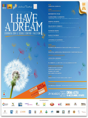 El Comité Arcigay Antinoo de Nápoles, Festival de Cine de ArTelesia - Escuela y Universidad 2014 - Edición VII - Asociación Internacional de Cine de la Competencia, el centro Sinapsi de la Universidad Federico II de Nápoles, Fondazione Genere Identità Cultura y Teatro Libero organizan la jornada "I have a dream", contra toda forma de discriminación. Sábado, 29 de Marzo, desde las 09,30 hasta las 13,00, en el Cine Astra, Via Mezzocannone, Universidad de Nápoles Federico II. El evento forma parte de los iniciativas de la X Semana de Acción contra el Racismo, organizada por UNAR (Oficina Nacional contra la Discriminación Racial de la Presidencia del Consejo de Ministros) y contará con la presencia de huéspedes del mundo de la cultura, el arte, la ciencia y el voluntariado social.