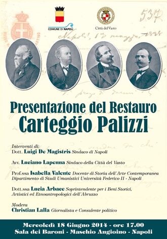Wednesday, June 18th at 5pmBarons Hall of Castel Nuovo, the Mayor of Naples, Luigi de Magistris, and the Mayor of Vasto, Luciano Lapenna, will present the restoration of the " Palizzi Correspondence" a set of 2897 papers ( letters, telegrams, photographs, drawings, newspaper clippings, certificates, poems etc.). belonging to the famous painter Filippo Palizzi (1818 -1899) and his three brothers who were also painters, Nicola (1820 - 1870), Giuseppe (1812 - 1888), Francesco Paolo (1825 -1871). They were born in Vasto, whereas in Naples they studied and started their artistic path.