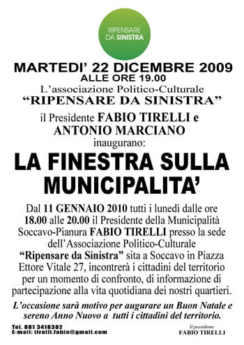 presso la sede dell'associazione politico culturale "Ripensare da Sinistra", sita in piazza Ettore Vitale 27, a Soccavo, alle spalle della sede della Municipalità, con la partecipazione di Fabio Tirelli, presidente della IX Municipalità e di Antonio Marciano, presidenza Regione Campania, ci sarà la presentazione della "FINESTRA SULLA MUNICIPALITA'".