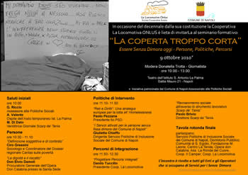 Se ne parlerà a Napoli, sabato 9 ottobre nel seminario nazionale, patrocinato dal Comune di Napoli, "La coperta troppo corta - Essere senza dimora oggi - persone, politiche, percorsi."