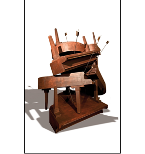 In mostra "Martirio", cinque pianoforti accatastati e trafitti da frecce, già presentato al Palazzo Reale di Portici in una personale organizzata dall' Assessorato alla Cultura del Comune di Portici.