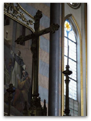 L'interno a croce latina a tre navate, restaurato in forme neo-gotiche dall'architetto Federico Travaglini 1850-1853), è rivestito di stucchi colorati e modanature dorate, con soffitto "a cassettoni".