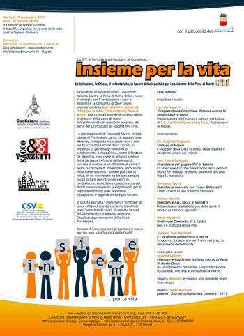Mercoledì 30 novembre, patrocinato dal Comune di Napoli, si terrà il convegno "INSIEME PER LA VITA", organizzato dalla Coalizione Italiana Contro la Pena di Morte Onlus nell'ambito del Progetto Giovani ed ILL-Legalità del CSV Napoli. L'incontro nasce in sinergia con l'associazione Sacco e Vanzetti e la Comunità di Sant'Egidio, promotrice della Giornata Internazionale "Città per la Vita-Città contro la Pena di Morte, che ricorda l'anniversario della prima abolizione della pena di morte dall'ordinamento di uno stato europeo, da parte del Granducato di Toscana nel 1786.