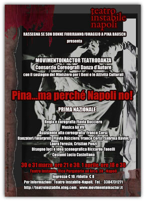 "Dopo il successo ottenuto con INSIDE/OUTSIDE presentato in dicembre al PAN/Palazzo delle Arti Napoli, la coreografa napoletana Flavia Bucciero torna nella sua città d'origine con Movimentoinactor Teatrodanza/Consorzio Coreografi Danza d'Autoreon per presentare uno spettacolo ispirato a Pina Bausch, la madre del teatro-danza europeo.