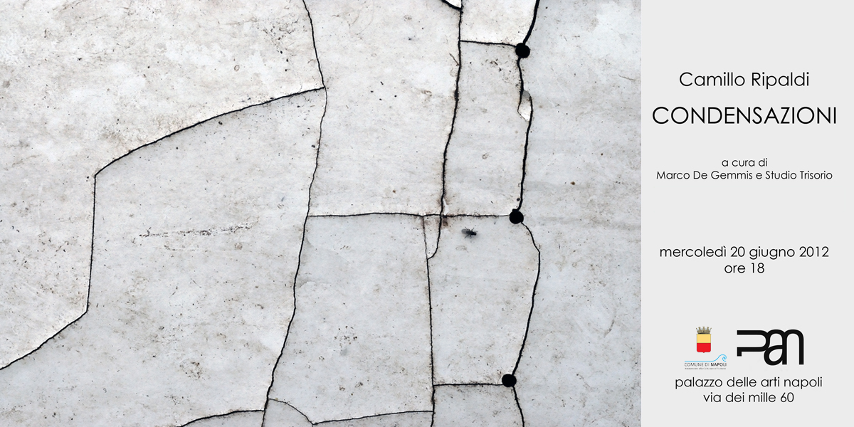 "Mercoledì 20 giugno alle ore 18, al PAN | Palazzo delle arti di Napoli (I piano), in via dei Mille 60, sarà inaugurata la mostra fotografica di Camillo Ripaldi Condensazioni, a cura di Marco De Gemmis e dello Studio Trisorio, realizzata in collaborazione con l'assessorato alla Cultura del Comune di Napoli. Fulcro della mostra è l'installazione 88 copulae, risultato della ricerca condotta da Ripaldi negli ultimi due anni: ottantotto immagini organizzate in un "discorso" di quattro "frasi" corrispondenti ad altrettante righe. In ognuna di queste si svolge una serie di ventidue "quadri": Lesioni, Coperchi, Carne, Bugiardini. |