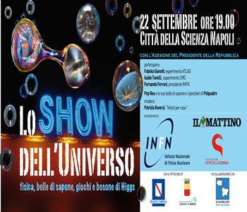 Sabato 22 settembre a Napoli, presso Città della Scienza, alle ore 19.00, è prevista l'unica presenza pubblica in Italia di Fabiola Gianotti, capo dell'esperimento che al CERN ha scoperto il bosone di Higgs. Promosso dall'Istituto Nazionale di Fisica Nucleare e da Città della Scienza con Il Mattino, l'evento ha l'adesione del Presidente della Repubblica, il patrocinio di Regione Campania e Comune di Napoli e la collaborazione de Le Nuvole e Psiquadro di Perugia.