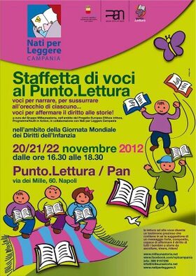 Martedì 20, mercoledì 21, giovedì 22 novembre, dalle ore 16.30 alle 18.30 al Punto.Lettura Nati per Leggere al PAN | Palazzo Arti Napoli. Il Punto.Lettura Nati per Leggere celebra il 23° anniversario dell'approvazione della Convenzione ONU sui diritti dell'infanzia e della adolescenza (20 novembre 1989), ospitando da martedì 20 a giovedì 22 novembre una tre giorni dedicata ai libri e alla lettura coinvolgendo le voci di tutta la città di Napoli! Grandi e piccini sono invitati a partecipare a una staffetta di letture, durante la quale si assisterà all'interpretazione di brani selezionati tra i titoli presenti nella piccola biblioteca "Pasquale Causa", che Nati per Leggere mette a disposizione di tutte le bambine e i bambini della città nei locali del PAN | Palazzo delle Arti Napoli. In linea con la missione del Progetto Nati per Leggere, l'immagine della staffetta ben si presta all'obiettivo dell'iniziativa: la lettura ad alta voce diventa un testimone prezioso che contiene in sé la suggestione di un messaggio forte, composito, capace di affermare il diritto di tutti i bambini a storie da ascoltare, vivere, ridere! |
