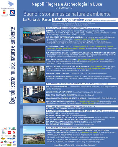 Interverranno il Vicesindaco Sodano e l'assessore all'Urbanistica De Falco Sabato 15 dicembre, dalle 9 alle ore 14, alla Porta del Parco - "Bagnoli: Storia, musica, natura e ambiente". Una giornata evento dedicata ad iniziative didattiche, formative, scientifiche, ambientali e culturali. All'interno delle piazze saranno allestiti stand e si svolgeranno attività legate al tema dell'educazione ambientale e della natura. Si potranno, inoltre, degustare prodotti tipici dei Campi Flegrei. Nel foyer saranno allestite mostre sulla storia industriale di Bagnoli, svolte attività scientifiche. Il Trio Gliceridi si esibirà in Aperitivo Jazz dei Campi Flegrei. Nell'auditorium verranno proiettati foto e video sul tema del mare e si terrà lo spettacolo Il "Canto delle sirene". Inoltre alle ore 12.00 interverranno il Vicesindaco di Napoli, Tommaso Sodano e l'assessore all'Urbanistica, Luigi De Falco. Infine all'interno dell'ex area industriale sarà realizzata una visita guidata; un percorso storico - naturalistico, di circa 1 chilometro a piedi, nell'archeologia industriale dell'ex Ilva di Bagnoli, alla scoperta della flora spontanea del luogo, con visite al Turtle Point e al vulcano Santa Teresa. L'evento sarà anche un'occasione per illustrare e far conoscere da vicino ai cittadini la trasformazione urbana in atto nell'area e le grandi potenzialità dell'ex sito industriale. L'iniziativa è stata possibile grazie all'adesione e alla collaborazione di numerose associazioni. |