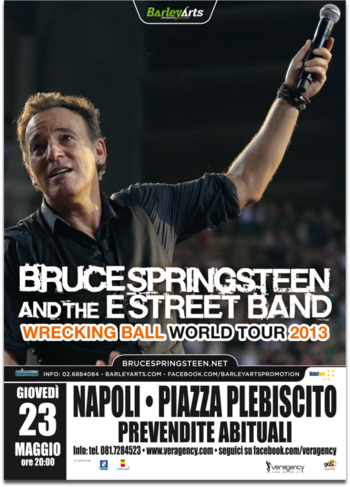 Bruce Springsteen And The E-Street Band ritornano dal vivo in Italia nel 2013 e per ben 4 concerti: si parte il 23 maggio a Napoli, in Piazza del Plebiscito, unica data al Sud-Italia. I biglietti già in vendita su tutti i circuiti autorizzati, costo: ingresso posto unico: 65,00 + 9,75 diritti di prevendita. La Springsteen-mania è esplosa contagiosa non solo a Napoli. Dei circa 20.000 biglietti venduti finora per il concerto-evento di Bruce Springsteen and the E-Street Band in Piazza Del Plebiscito, molti sono stati acquistati fuori dalla Campania. Numerosi fan, turisti e appassionati di rock da tutto il mondo hanno già acquistato i tagliandi per l'imperdibile live. Nello specifico sono stati venduti biglietti ovunque nel mondo: dagli Stati Uniti al Canada, da Singapore all'Australia, da Israele alle Isole Vergini. Senza contare i paesi europei come Francia, Svezia, Germania, Inghilterra, Spagna, Austria, Svizzera, Olanda, Belgio, Norvegia, Croazia e persino Irlanda, Georgia, Slovacchia, Grecia e Romania. |