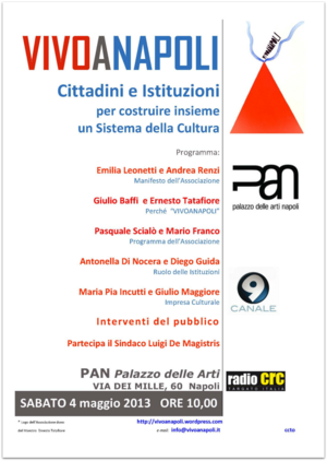 Emilia Leonetti e Andrea Renzi Manifesto dell'Associazione Giulio Baffi e Ernesto Tatafiore Perché "VIVOANAPOLI" Pasquale Scialò e Mario Franco Programma dell'Associazione Antonella Di Nocera e Diego Guida Ruolo delle Istituzioni Maria Pia Incutti e Giulio Maggiore Impresa Culturale Partecipa il Sindaco Luigi De Magistris |