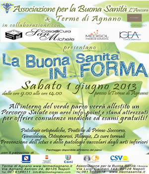 Si invita la cittadinanza ad intervenire alla manifestazione la Buona Sanità In.....Forma Sabato 01 giugno 2013 nel Parco delle Terme di Agnano ove saranno allestiti degli stand con la presenza di medici di varie specializzazioni che forniranno consulenza gratuita circa le patologie ortopediche, osteoporosi e problematiche ginecologiche, patologie allergiche e stagionali. |