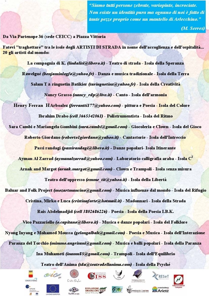 Il pomeriggio si apre alle 16.30 con documentari, reportage e testimonianza dal vivo a cura delle associazioni aderenti all'iniziativa. I volontari del CEICC, guidati da Franca Sibilio, traghetteranno i cittadini verso le isole degli artisti che si esibiranno sul lungomare di Via Partenope fino alle 22.00.