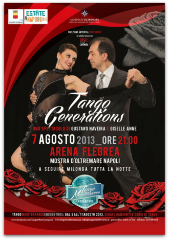 "Tango Generations", tra i più grandi spettacoli di tango argentino al mondo, unica tappa in Italia a Napoli mercoledì 7 agosto, all'Arena Flegrea, rappresenta l'evento di punta di "Tango Mediterraneo Encuentros", manifestazione che durerà dal 6 all'11 di agosto proponendo una sei giorni dedicata al tango tra seminari, workshop, milonghe e tanto altro ancora, nata dalla collaborazione tra Tango in Rete Campania e Mostra d'Oltremare, con la direzione artistica di Stefi Donisi.