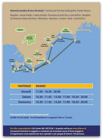 Il presidente Lauro ha poi precisato che l'iniziativa, contrariamente a quanto commentato da qualcuno, non ha bisogno di alcuna autorizzazione comunale considerato che le eventuali competenze sono ascrivibili all'autorità portuale e che non si necessita di alcun bando pubblico di affidamento considerato che non esistono fermate intermedie trattandosi di un semplice giro turistico offerto da un operatore privato. L'inaugurazione, ad invito, è prevista, con il taglio del nastro del Sindaco, alla presenza delle massime autorità cittadine e regionali, tutte invitate per sabato 7 settembre alle ore 11.00 presso il Terminal di Mergellina,pontile AliLauro.