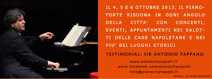 Dopo il successo di Piano City Berlino 2010 e Milano 2012/13, Napoli festeggia il pianoforte in un week end con una delle manifestazioni più trendy in Europa: il 4, 5 e 6 ottobre 2013, il pianoforte risuona in ogni angolo della città con concerti, eventi, appuntamenti nei salotti delle case napoletane e nei più bei luoghi storici, dai musei ai teatri alle piazze.