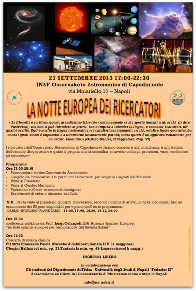 I ricercatori dell'Osservatorio Astronomico di Capodimonte faranno conoscere alla cittadinanza e agli studenti delle scuole di ogni ordine e grado la propria attività scientifica attraverso colloqui, proiezioni, visite, conferenze ed esperimenti.