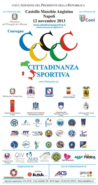 Martedì, 12 novembre 2013 dalle ore 10.00 alle 12.30, presso il Maschio Angioino di Napoli si è tenuto il convegno dal titolo "Cittadinanza Sportiva", organizzato da a.s.d. KODOKAN Sport Napoli e dalla Federazione Stranieri in Italia - F.I.L.S.E.M., in collaborazione di Aics Napoli (Associazione Italiana Cultura Sport) e Gesco.
