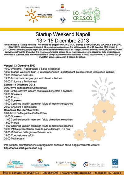 Torna a Napoli lo "Startup Weekend" nell'ambito del progetto I.O.CR.E.S.C.O. sostenuto dalla Fondazione CON IL SUD nell'ambito dell'invito "Sviluppo Locale 2010" e che insiste sul territorio della VI Municipalità del Comune di Napoli (Barra, Ponticelli, San Giovanni a Teduccio). Tale progetto ha ricevuto un ulteriore cofinanziamento dalla Fondazione "Vismara" di Milano e i patrocini morali dalla Regione Campania, dal Comune di Napoli e dalla stessa VI Municipalità. Con lo "Startup Weekend" avrà inizio una maratona di 54 ore nel corso di un intero fine settimana dal 13 al 15 dicembre 2013 presso il CSI - Centro Servizi Incubatore Napoli Est, in via Bernardino Martirano n. 17 - Napoli.