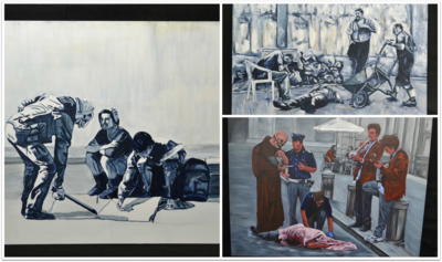 Ogni giorno milioni di persone percorrono strade che li portano da non luoghi ad altri non luoghi. Sono le vie delle grandi metropoli urbane, delle banlieu, degli agglomerati dove gli esseri umani corrono, come lemming impazziti, verso la catastrofe socio ecologica del terzo millennio. Sono gli abitanti che vivono le agonie dei non luoghi, di mostri delle grandi conurbazioni deprivate delle identità e delle storie; i mostri dove ogni frazione di città finisce per essere un mondo altro rispetto ad una storia ed una memoria. Le ansie etnocentriche delle concentrazioni forzate di etnie spesso distanti fra loro annullano ogni possibilità di creazione di un mondo che abbia un progetto e le distopie di questa esistenza creano soltanto una maligna evoluzione di disuguaglianze. E' Blade Runner che prende forma, per lo meno nella sua mostruosa accezione socio-urbanistica. E l'agonia di Los Angeles diviene quella di Parigi, Londra, Berlino, Milano, Roma, Napoli ed il sogno di una società pacifica è tramontato, sostituito da una relazione in cui la violenza stessa è la nervatura del rapporto individuale e collettivo. A che serve ancora l'arte? Ha ancora senso ricercare una bellezza sempre più lontana dalla sua vera essenza filosofica e sempre più legata ad una vuota estetica di mercato? Le risposte attraversano, senza omogeneità, l'intero mondo della cultura e dell'arte. Per capirci: uno dei problemi più drammaticamente urgenti dell'intero territorio nazionale, le grandi organizzazioni mafiose, diventano, nell'immaginario collettivo, cinema da Oscar. E, questo, è un discorso pericoloso. Paolo Naldi parte da questa esperienza per rileggere la visione del contemporaneo e le dirompenti contraddizioni del terzo millennio; i cicli del suo lavoro si basano su di una pittura dura, senza mediazioni, e che mostra all'estremo la deriva conflittuale della storia della nuova forma dell'umano.