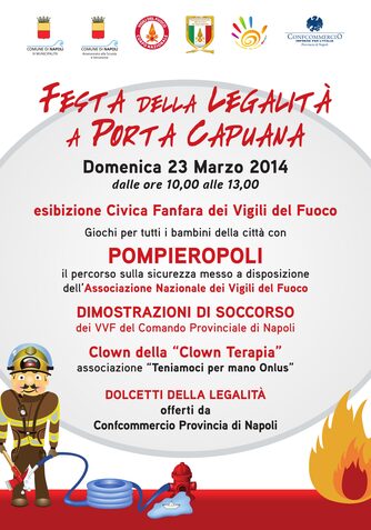 Il giorno 23 marzo 2014 dalle 10.00 alle 13.00 si terrà la Festa della Legalità a Porta Capuana, che avrà inizio con l'esibizione della Civica Fanfara dei Vigili del Fuoco. L'evento, nato dalla collaborazione tra l'Assessorato alla Scuola del Comune di Napoli e la Municipalità IV, prevederà giochi per tutti i bambini della città che accorreranno, grazie al sostegno ed alla presenza di Pompieropoli, il percorso sulla sicurezza messo a disposizione dell'Associazione Nazionale dei Vigili del Fuoco. Durante l'evento saranno presenti anche i Clown della "Clown Terapia" dell'associazione "Teniamoci Per mano Onlus" così da rendere la festa ancora più giocosa e divertente. |