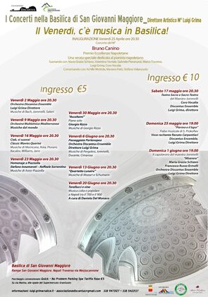Il soprano Cinzia Rizzone ed il mandolinista Agostino Oliviero soro i protagonisti del prossimo appuntamento de Il Venerdì, c'è musica in Basilica! Il concerto vuole essere un viaggio nella produzione musicale italiana strumentale e vocale dal 700 al 900, passeggiando con disinvoltura dalle arie di Giovanbattista Pergolesi alla canzone di Tosti, da uno spumeggiante Gaetano Donizetti ad una trascinante Fiera de Mastr'Andrea, passando per i versi di Salvatore Di Giacomo. Al centro, un incantevole concerto per mandolino ed archi di Domenico Gaudioso, la cui scrittura contrappuntistica offre il giusto valore a questo strumento troppe volte relegato all' accompagnamento della canzone napoletana.