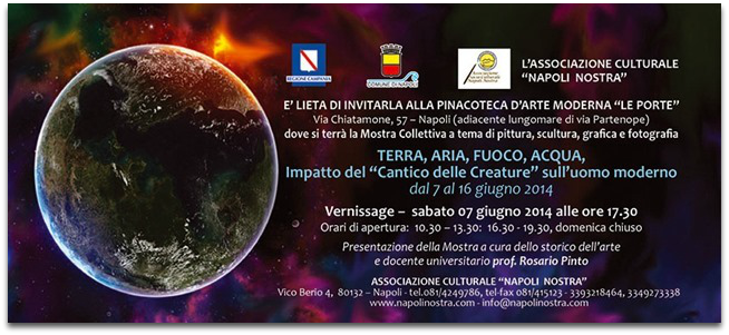Gli ultra secolari principi enunciati nel "Cantico delle Creature" sono un riferimento di grande attualità per la salvezza del nostro pianeta, che in seguito all'inquinamento crescente, causato dall'uomo, corre grossi rischi di distruzione. Inoltre, la scomparsa del "principio di fratellanza", alla base dello stesso "Cantico", sta portando tra i popoli guerre ed eccidi continui e l'imperante potere economico sta conducendo gli uomini ed i popoli a smodate competizioni, svuotandoli della loro essenza umana. La Mostra sarà presentata dal critico e storico dell'arte prof. Rosario Pinto che al vernissage terrà un dibattito sul tema della Mostra, a cui parteciperà come moderatore, il direttore artistico dell'Associazione "Napoli Nostra" ing. Gennaro Corduas. Durante l'inaugurazione il maestro Joe Ronca si esibirà con brani classici napoletani e inediti accompagnandosi con chitarra classica. Artisti partecipanti provenienti dall'intero territorio nazionale ed alcuni anche europeo: Rossella Andriani, Anna Maria Artegiani, Giulio Belloni, Stefano Benazzo, Manuel Benjumeda, Fiorenzo Bertin, Lino Bianco, Maria Bonfiglio, Milvia Bortoluzzi, Alda Boscaro, Laura Bruno, Roberto Campagna, Fabio Castagna, Maria Colletti, Alba D'Alpaos, Claudio De Pasquale, Geltrude De Simone, Anna Nunzia Ercole, Carolina Ferrara, Luisella Furlan, Anna Galanga, Ida Gorgolini, Francesca Guetta, Carmine Carlo Maffei, Sandra Marcelloni, Giovanna Marrone, Mario Masoli, Aurora Mazzoldi, Teresa Palombini, Paola Augusta Pettini, Salvatore Piras, Liana Piva, Elettra Spalla Pizzorno, Mirella Proietti, Nanda Rago, Pierluigi Ricci, Gioacchino Rinallo, Nicola Romilio, Mirko Roncelli, Raffaello Rubino, Lucillo Santesso, Claudio Scandura, Lucia Simeone, Giacomo Giovanni Stecca, Federico Tamburri, Angelo Timpanaro, Miriam Tornese, Maria Tufano, Anna Turro, Maria Felice Vadalà, Valentina Valente, Lilia Viriglio, Canziana Virtu', Claudia Vivian, Enzo Zanetti, Lello Zito. |